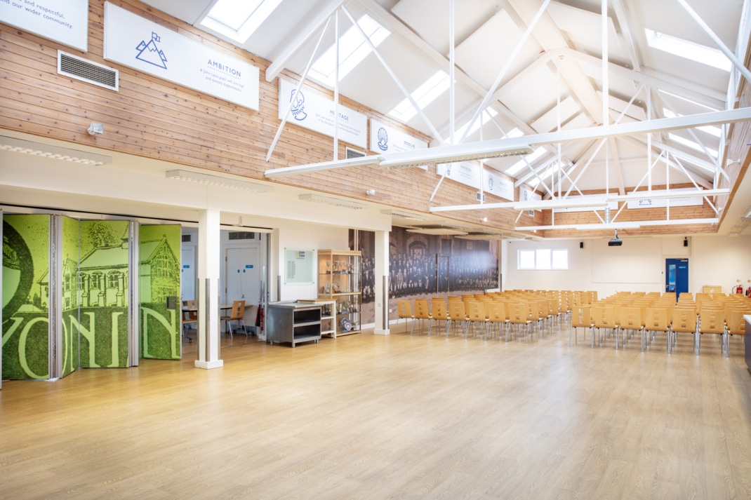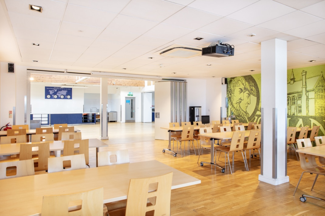 Located in our Senior Campus, Middle Road, Harrow-on-the-Hill, London, HA2 0HN, this space benefits from a separate area, ‘The Refectory’ which accommodates up to 75 people standing and 60 seated for dining. Both areas can be hired separately or as one large area with full flexibility on set-up and layout based on your requirements.