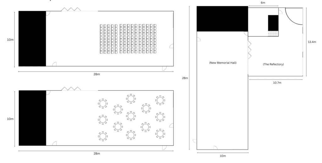 For reference, the dimensions of the hall are: 28m x 10m, The Refectory dimensions are: 10.7m x 13.4m x 6m